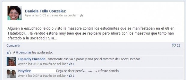 "Alguien a(sic) escuchado,leido (sic) o visto la masacre contra los estudiantes que se manifestaban en el 68 en Tlatelolco?... la verdad estaria (sic) muy bien que se repitiera pero ahora con los maestros que tanto han afectado a la sociedad!! Siiii...", escribió Daniela Tello González en su cuenta de Facebook.
